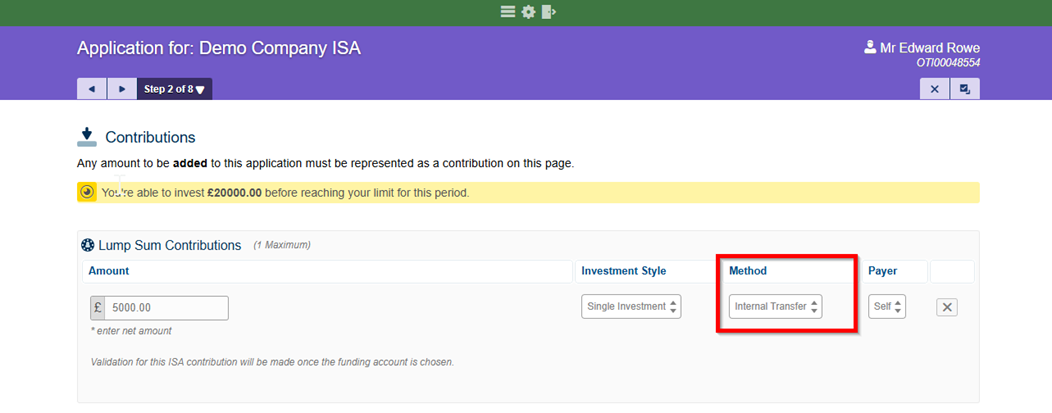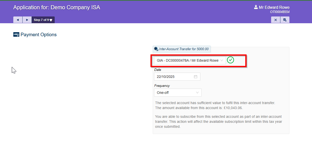 By using the “Internal Transfer” payment method within an ISA account's ‘Application’ or ‘Add/Amend Contributions’ journey, you can set up a one-off or a recurring value to be transferred from a chosen GIA (including a Joint GIA if required).