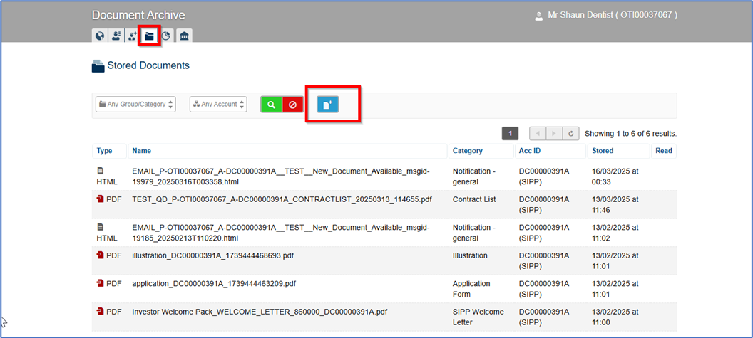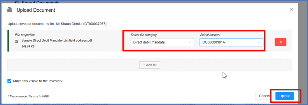 For SIPP Employer Regular contributions, the IFA must obtain the Employer's signature (electronic or physical are both fine). The Direct Debit Mandate can be produced in PDF format as part of the Account Opening and/or Add/Amend Contributions User Journey, and the signed document must be uploaded into the portal via the blue upload button in the Document Archive area of your Investor’s Record: