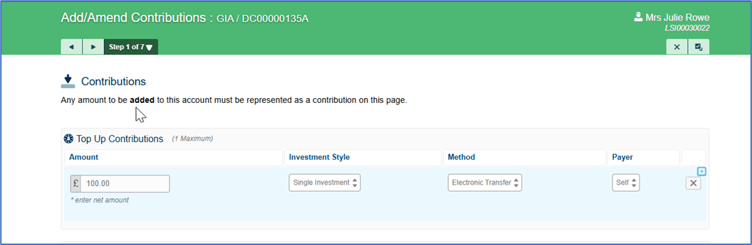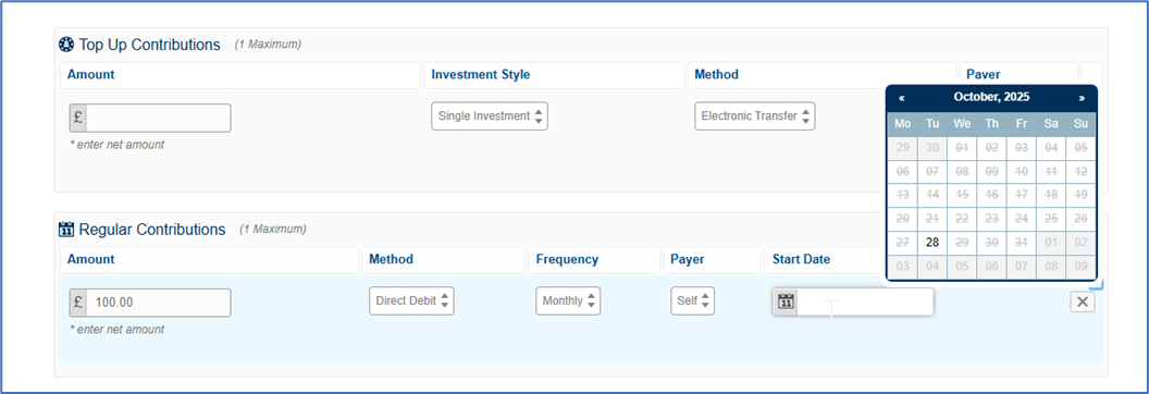 If your investor wants to contribute before the next available date, then you can instruct a one-off Top Up via Add/Amend Contributions: