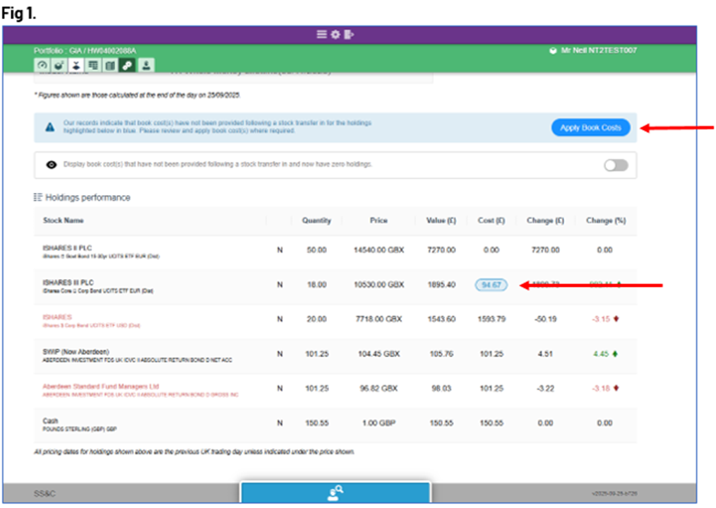 Its is possible to update book costs at account level on the Portfolio overview screen. At the top of Fig 1, there is an option to “Apply Book Costs” at an account level. Once this option is selected, a pop up will be displayed (Fig 3) showing the impacted assets and the option to update and apply the original book cost.
