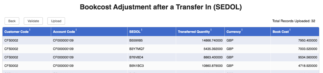 Through the selection of Bookcost Adjustment after a Transfer in (ISIN), the following screen is presented: