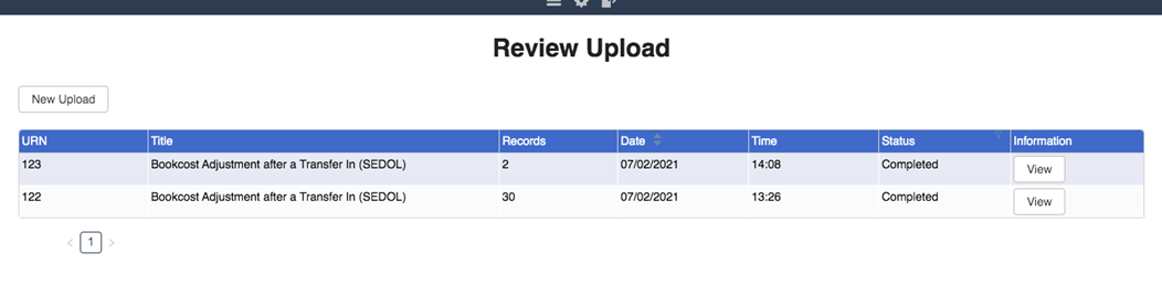 With no errors arising the file is then available for “Upload”. Selecting “Upload” will place the file on a queue for processing. It should not take longer than 15 minutes to process file. You can view the files that have been uploaded through the below page. When the file is awaiting processing, the status will be “New”. For processed files the status can be either “Error” or “Completed”.