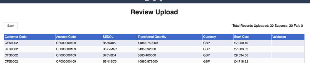 With a file available for upload, simply select the upload button. This will prompt you to select a file from your file store. The file will then be loaded into the application and the file records will be presented in the table as shown below: