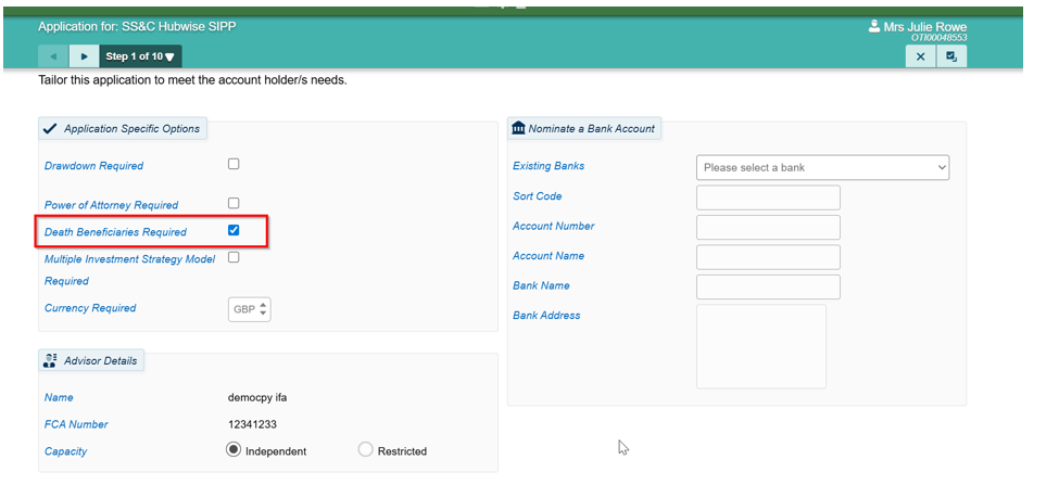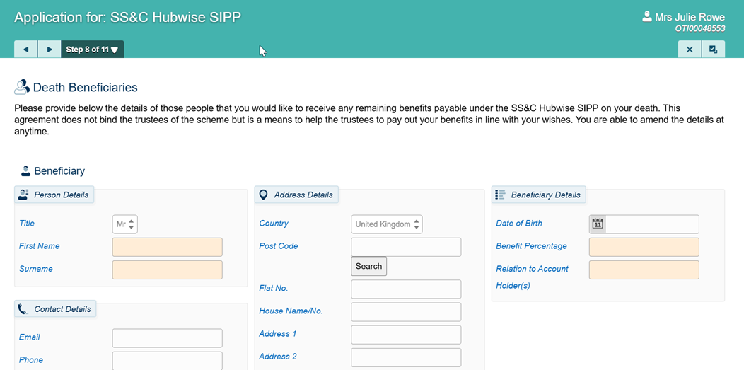 You can record beneficiaries on the portal- the default displays Death Beneficiaries Required – but you can untick this if you wish to complete these details at a later stage. Best practice is to complete as part of the Account Opening Journey if possible:
