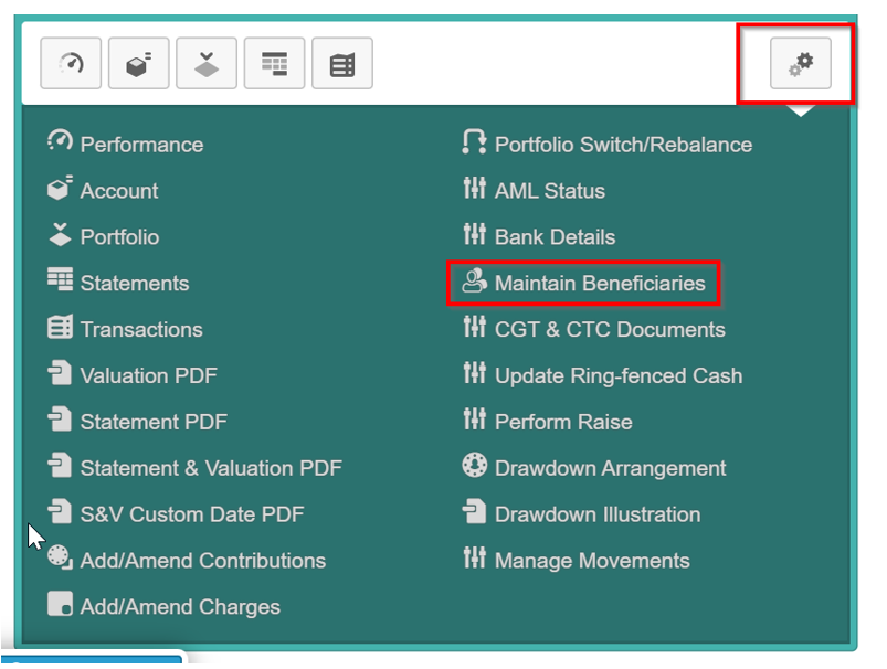 You can amend and/or add to Beneficiary information in the Portal once the SIPP Account has been opened, using ‘Maintain Beneficiaries’ in the All-Account Actions (double cog icon) dropdown: