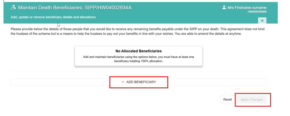 If you are changing Beneficiary information where the previous Allocation was 100% you will firstly need to reduce the Allocation to allow for the ‘Add Beneficiary’ Option to be displayed and selected.